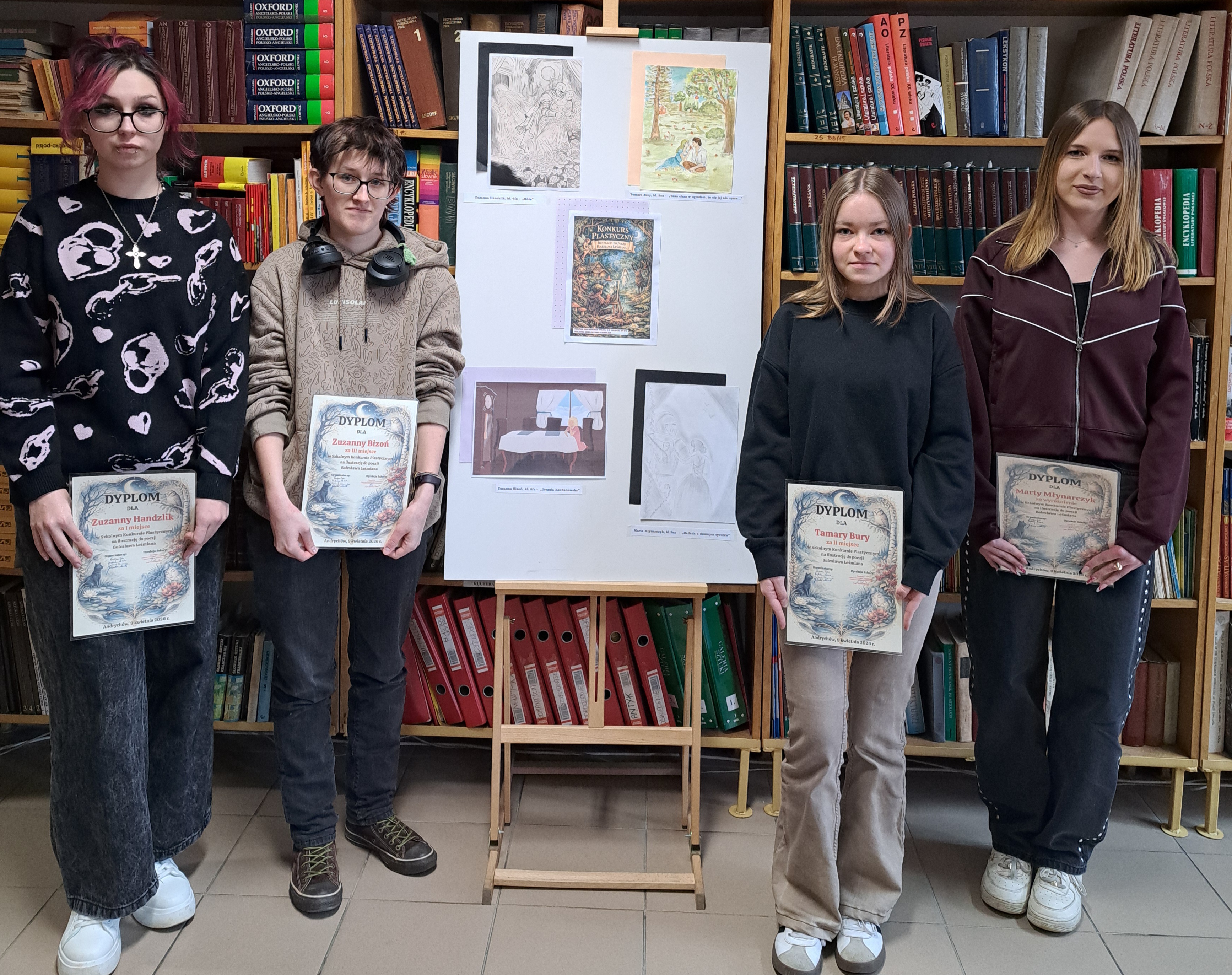 Jurorzy, czyli bibliotekarz szkolny i nauczyciele poloniści,  I miejsce przyznali grafice do wiersza „Róże” wykonanej przez Zuzannę Handzlik z kl.4fn,  II miejsce zdobyła ilustracja do wiersza „Taka cisza w ogrodzie…” Tamary Bury z 3en, III miejsce – uzyskała praca Zuzanny Bizoń z 5fn, a wyróżnienie otrzymała Marta Młynarczyk z 3en.